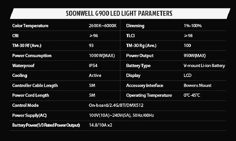 Выходная мощность прибора составляет 900 Вт теплого белого или 900 Вт холодного белого света. Яркость на 1 м при 5600 К со средним рефлектором 123000 люкс и 20000 люкс без рефлектора.